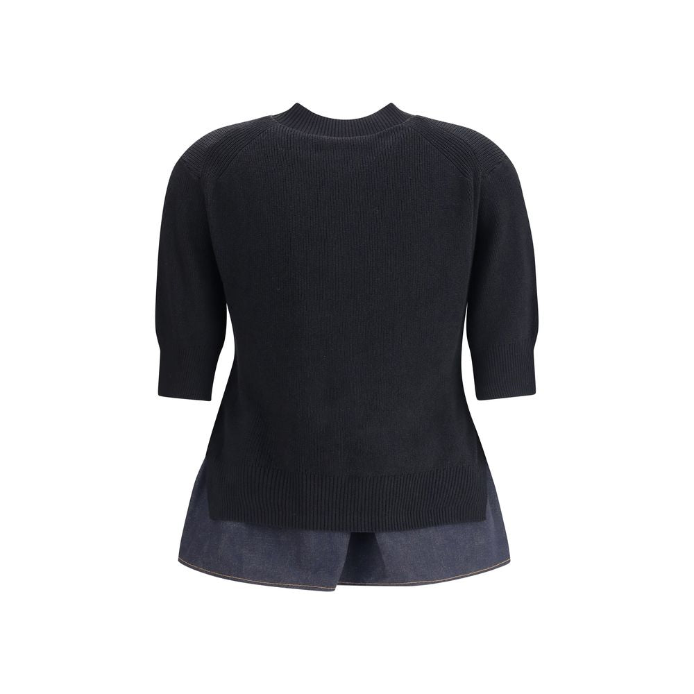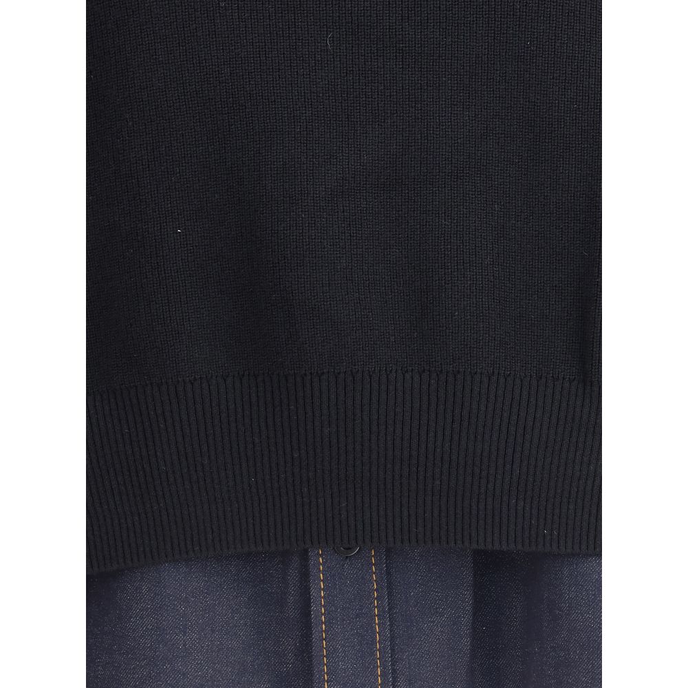 Sacai’s Denim detail Sweater combines casual style with tailored construction. Featuring 3/4 sleeves and a ribbed crew neck, it features an original double-layered design with denim inserts at the bottom, giving the garment a distinctive and contemporary layered effect.