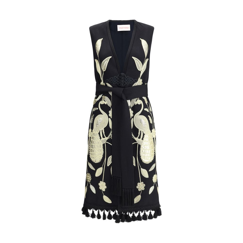 Valentino’s embroidered long Vest is an extraordinary garment that blends elegance and sartorial artistry. With a frog front closure, it features a hemline embellished with tassel appliqués, enhancing its movement. The built-in fringed scarf adds a touch of sophistication, while gold embroidery, inspired by nature, gives a rich and sophisticated visual effect. A uniquely styled garment, perfect for those seeking a distinctive and classy look.