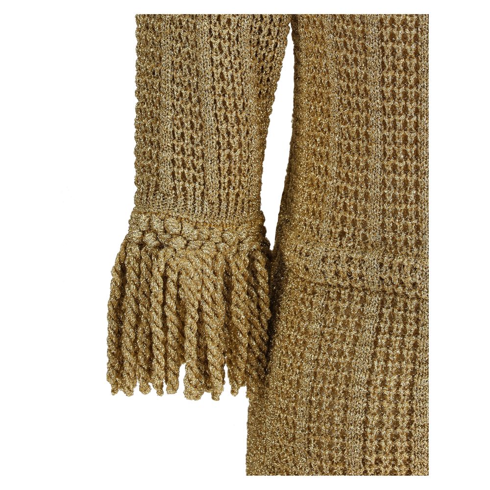 Valentino’s short Dress is an elegant and sophisticated piece that combines style and originality to perfection. Made of lurex knit, the shiny fabric discreetly catches the light, lending a touch of sophistication. The design features a V-neckline that adds an accent of sensuality, while the adjustable drawstring waist allows you to easily adjust it to your silhouette. The two side slits give movement to the dress, making it dynamic and feminine, while the sleeves with tassels, a distinctive detail, add a bohemian and sophisticated touch.