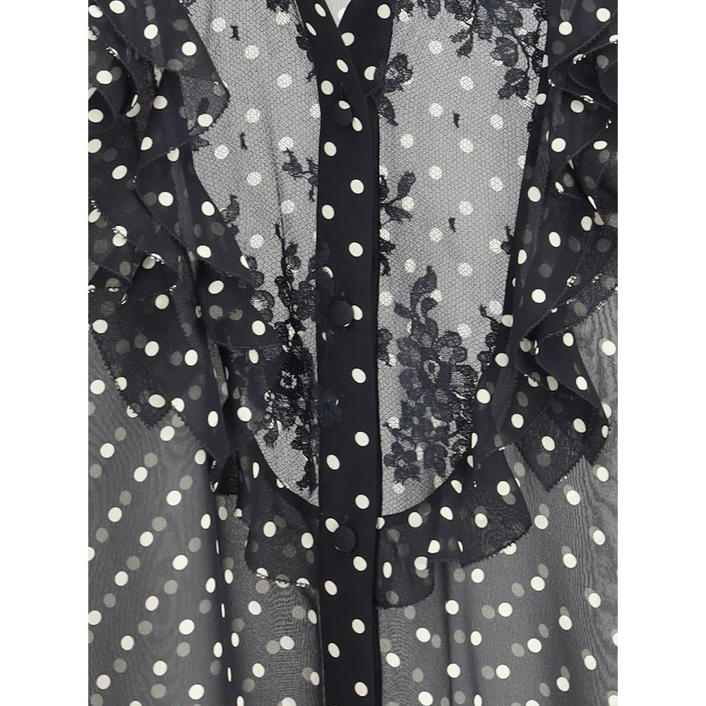 Silk Shirt by Valentino featuring a delicate semi-transparent polka dot pattern. It features a mandarin collar and front button closure. The cuffs are embellished with applied lapels and ruffles, while the front of the shirt is decorated with ruffles and a fine semi-transparent lace detail, adding a touch of elegance and femininity to the design.