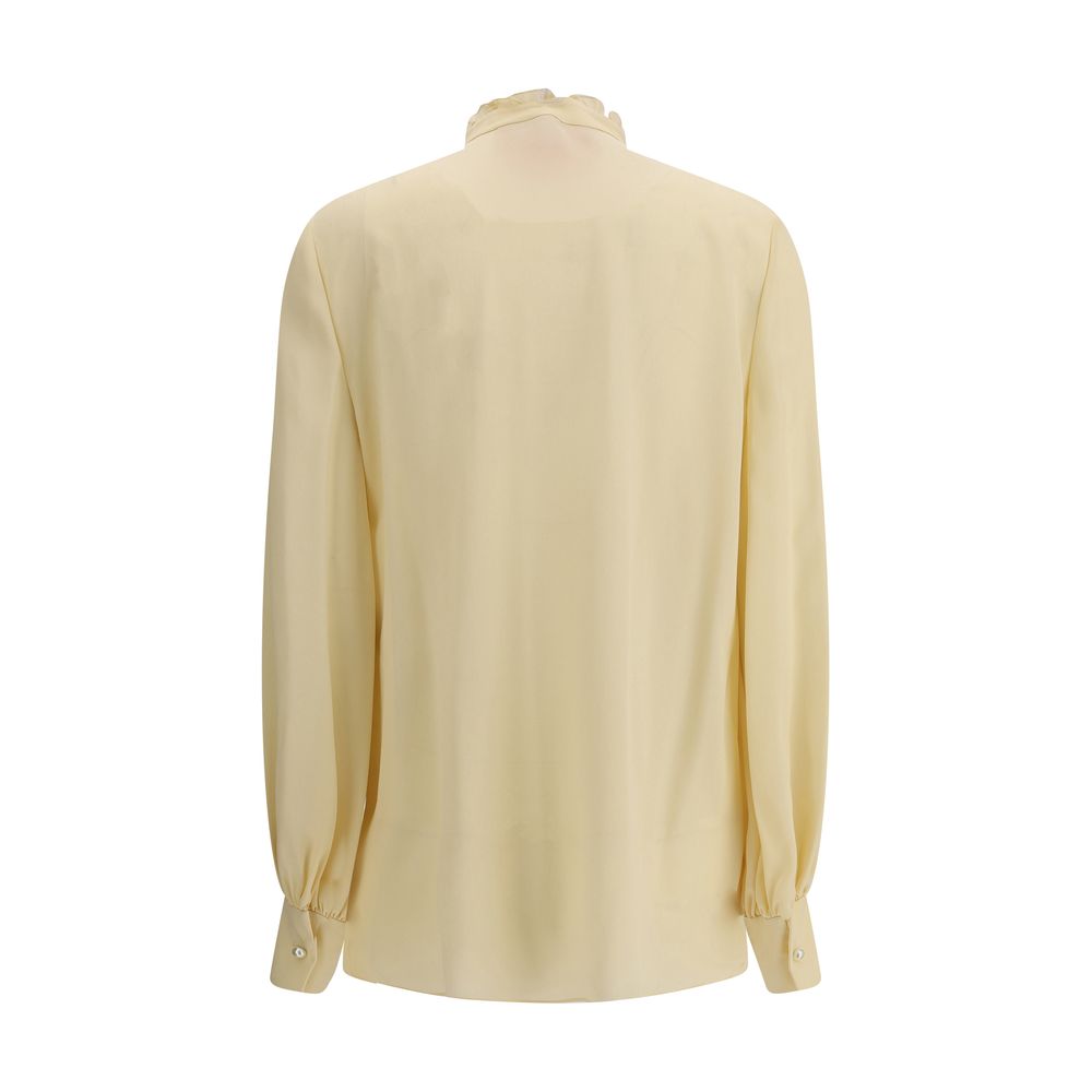 Silk Shirt by Valentino features a mandarin collar and front closure with pearl buttons. The adjustable cuffs are embellished with pearl buttons, while the front of the garment features applique drape details, adding a touch of elegance and sophistication to the design.